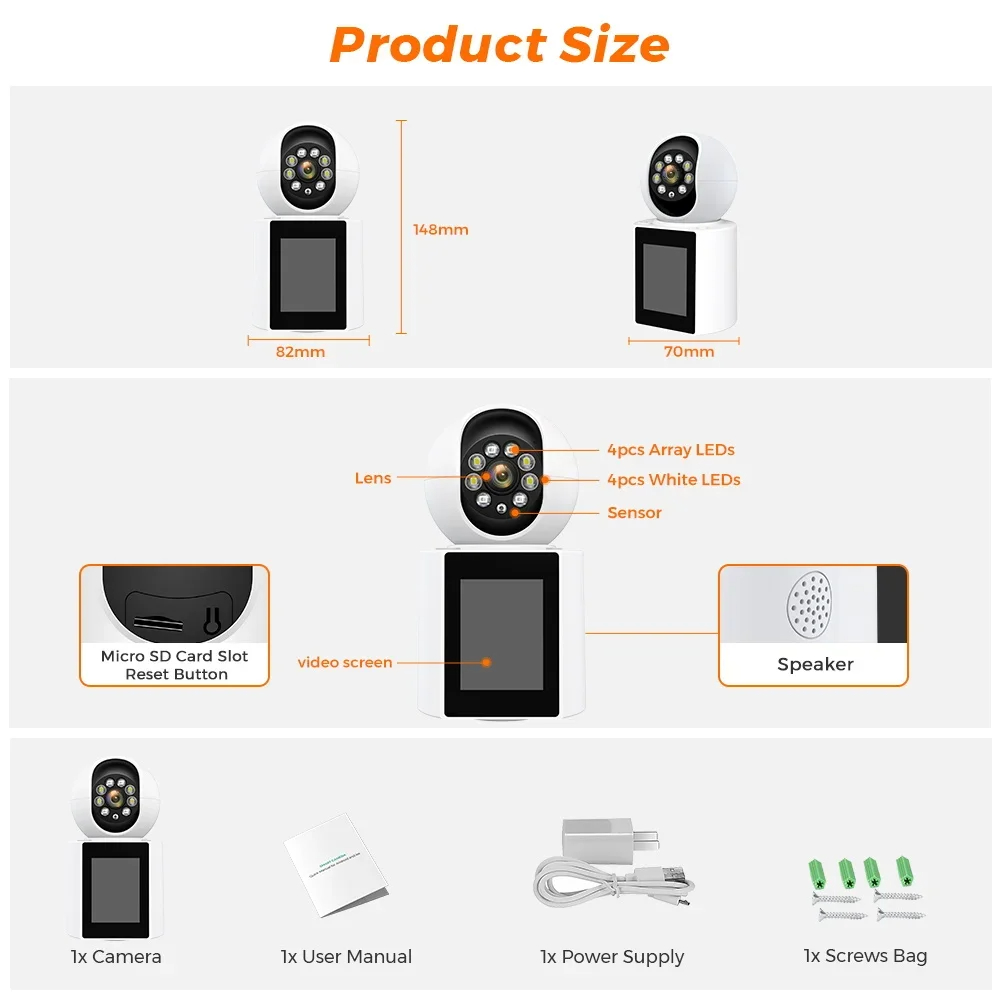 Камера оснащена 2.8-дюймовым дисплеем, поддерживает двустороннюю видео-связь, обеспечивая реалистичный визуальный опыт. Функция распознавания человека поддерживает идентификацию нескольких людей одновременно и обеспечивает автоматическое масштабирование с отслеживанием на расстоянии более 15 метров. Поддерживает карты памяти TF объёмом от 8 до 128 ГБ. Питание осуществляется от источника DC 5V/2A через 1-метровый кабель Type-C.Упаковка: 50 устройств в коробке, размеры внешней коробки — 46×38×54.6 см, общий вес — 17.8 кг. Размер одного устройства — около 84×86×18.7 мм, вес — примерно 0.35 кг.